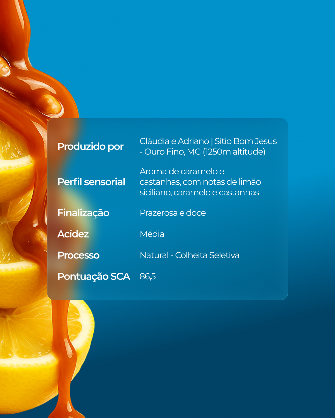 Produzido pela Cláudia e pelo Adriano na Fazenda São Bom Jesus, a 1250 metros de altitude, em Ouro Fino, MG, o Arara é um café com notas sensoriais de limão siciliano, caramelo e castanhas com aroma de caramelo e castanhas. Sua finalização é prazerosa e doce, com acidez média. Seu processo é natural, com colheita seletiva, e sua pontuação é de 86,5 pontos na escala oficial da SCA.